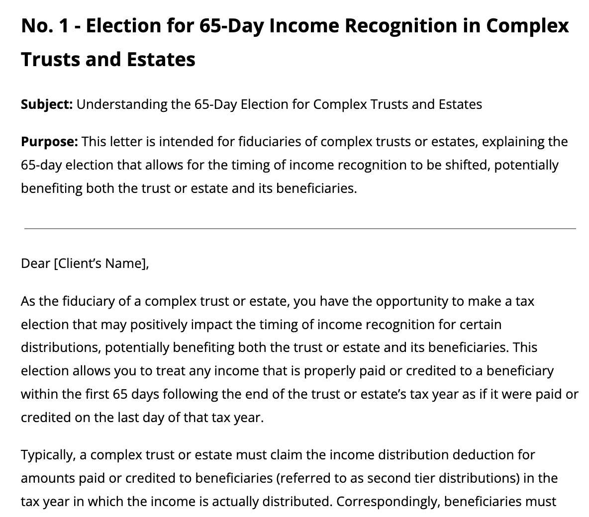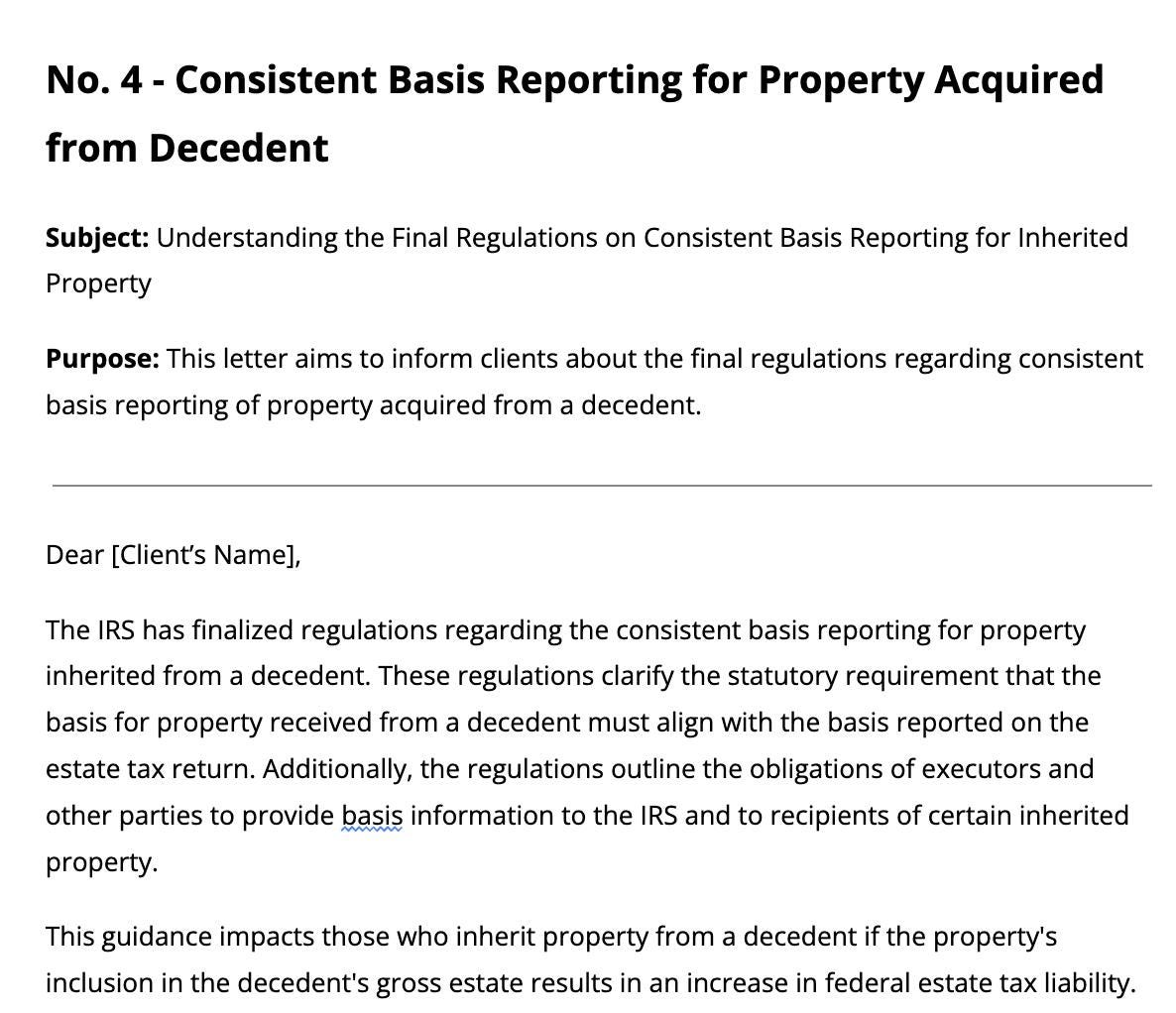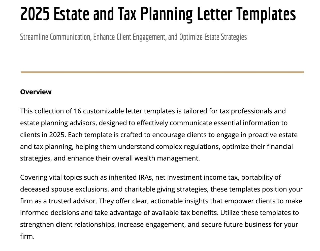 Each template addresses crucial topics like inherited IRAs, net investment income tax, gift tax exclusions, and the portability of a deceased spouse’s unused exclusion. With these letters, you can simplify complex information, encourage proactive planning, and position your firm as a trusted advisor.
