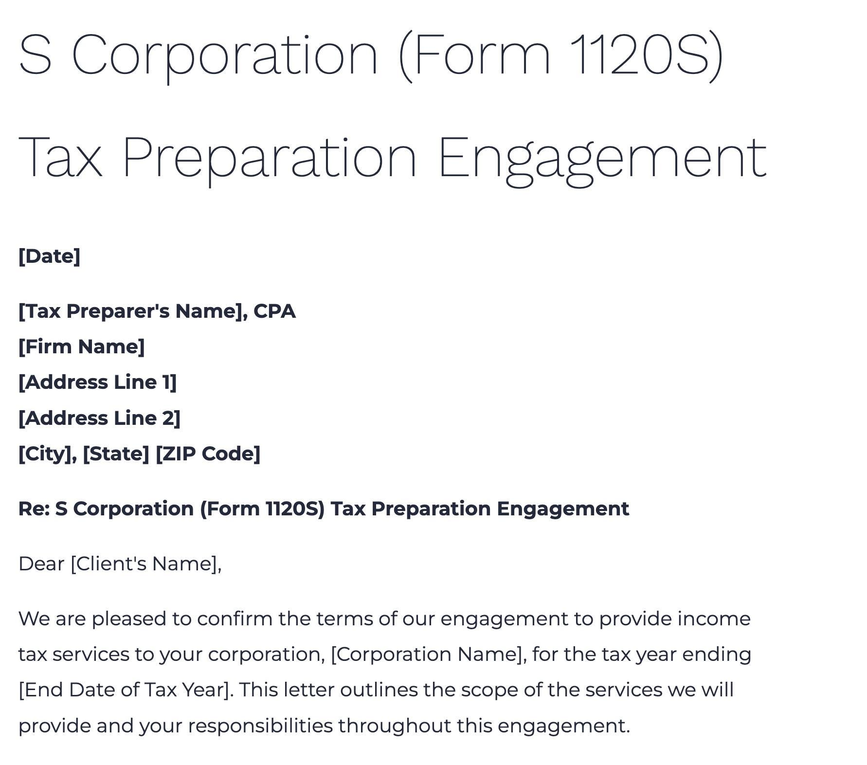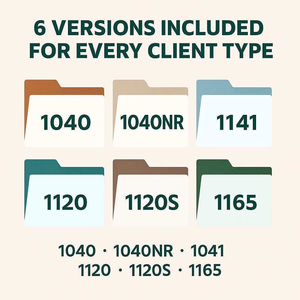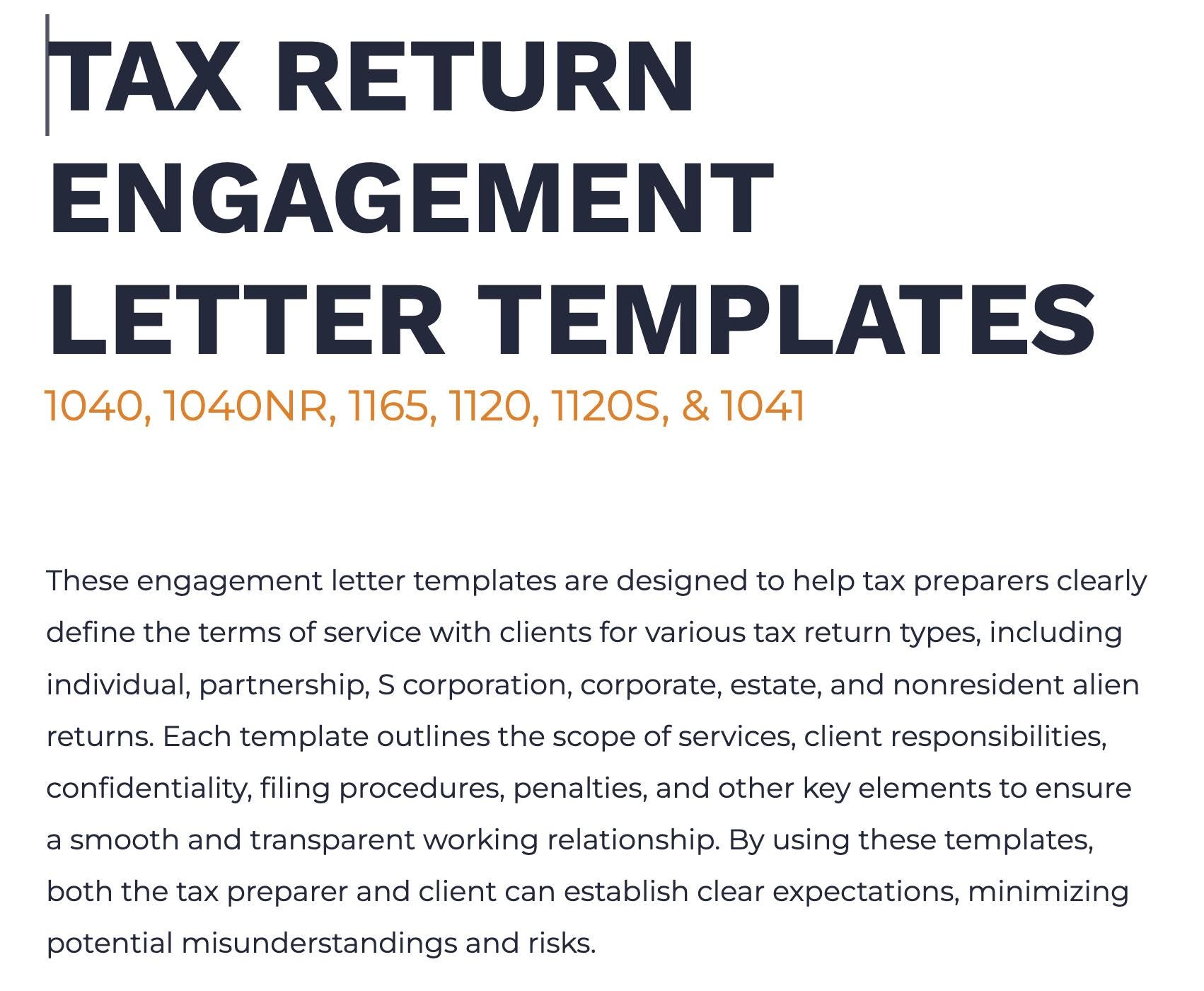 Each template is professionally written and formatted to cover Forms 1040, 1040NR, 1120, 1120S, 1065, and 1041 for individual, business, and fiduciary clients.