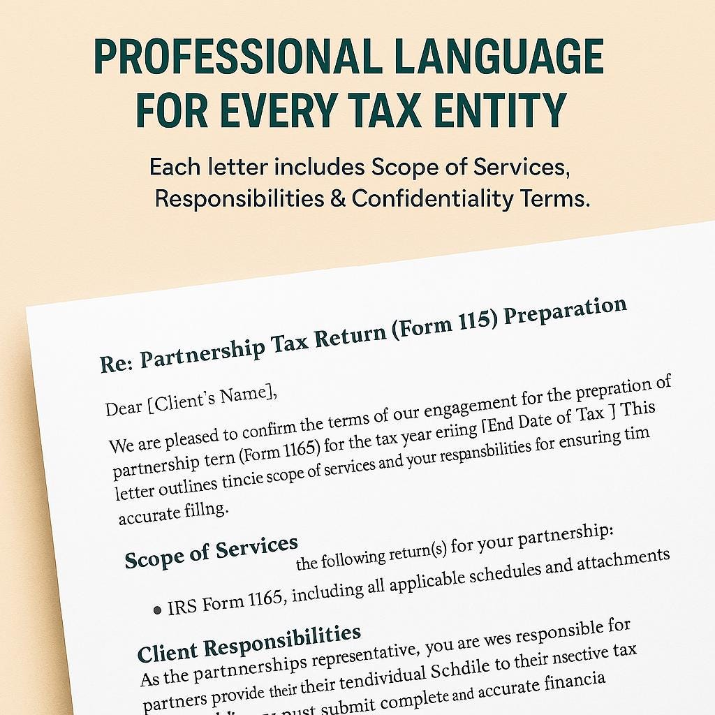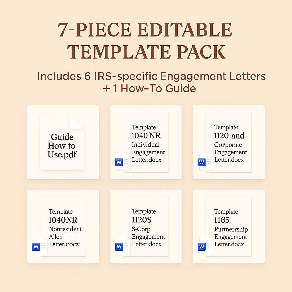 • Six editable engagement letter templates (Word + PDF) for individuals, corporations, partnerships, and estates