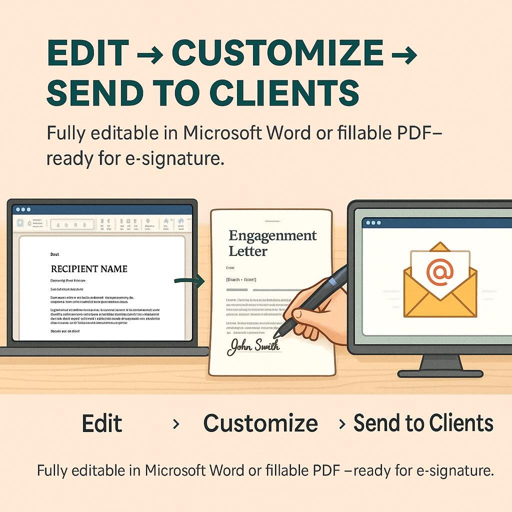 The CPA Engagement Letter Template is a professional, editable document pack designed for CPAs, accountants, enrolled agents, and tax preparers who want to clearly define the scope of work and set proper client expectations.
