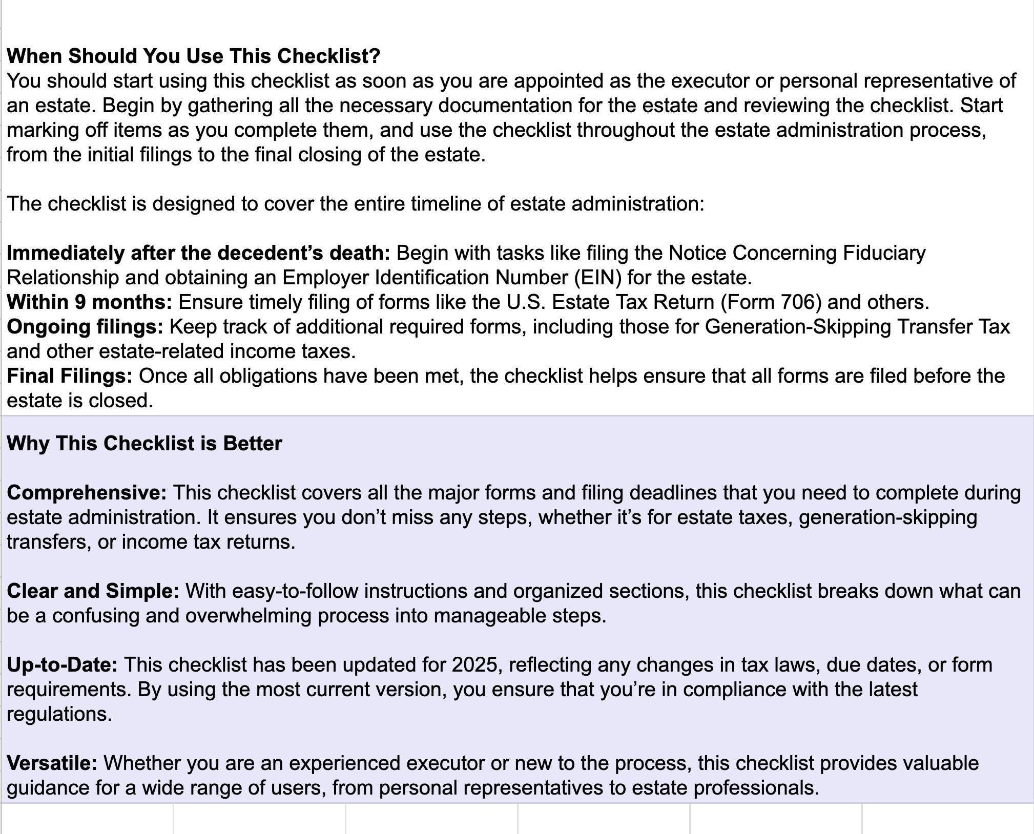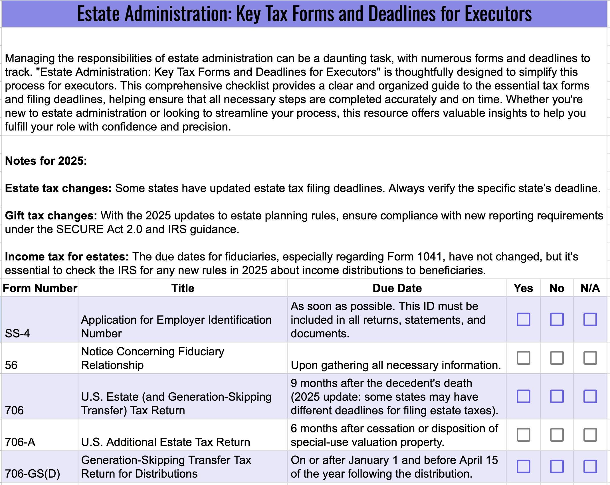 Simplify the complex process of estate administration with the “Estate Administration: Key Tax Forms and Deadlines for Executors” checklist. Designed for executors, administrators, and personal representatives, this comprehensive guide outlines essential tax forms and filing deadlines, ensuring that you stay organized and meet all required deadlines. From initial filings to final tax returns, this checklist provides clear, step-by-step instructions to help you navigate the estate administration process with confidence and accuracy. Perfect for those new to the role or experienced executors looking to stay on track, this tool ensures timely compliance with tax regulations.