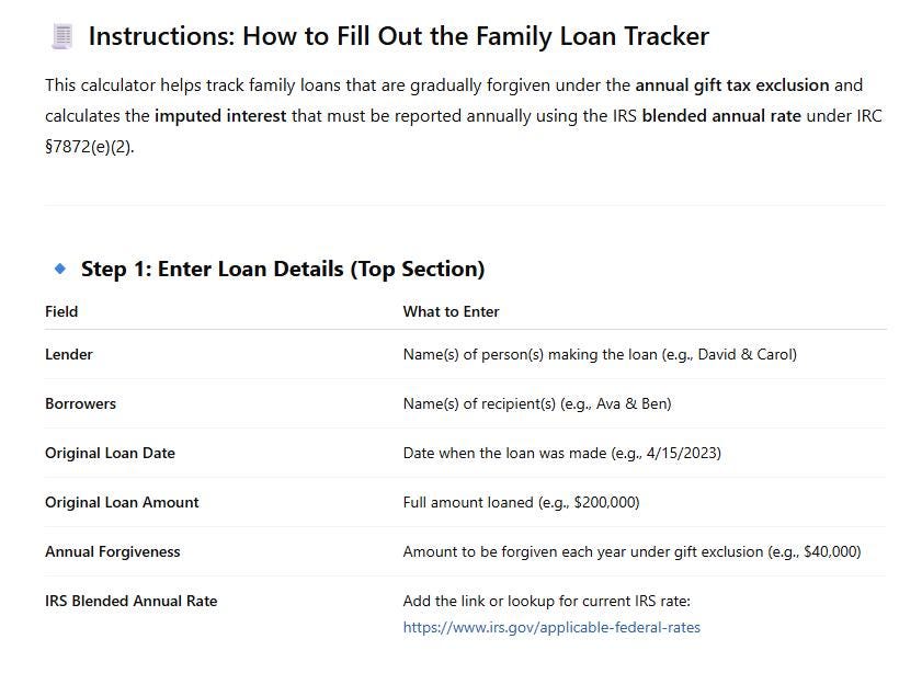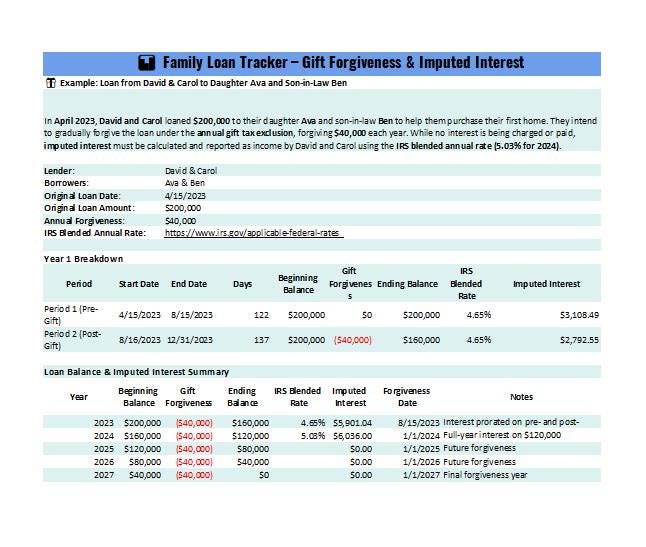 Simplify your family lending recordkeeping with this Family Loan Tracker Excel Template, purpose-built to help parents and grandparents track gift loans, annual forgiveness amounts, and IRS imputed interest under Section 7872. Whether you’re lending money to a child or relative for a home purchase or education, this tool ensures you’re compliant and organized‚Äîyear after year.