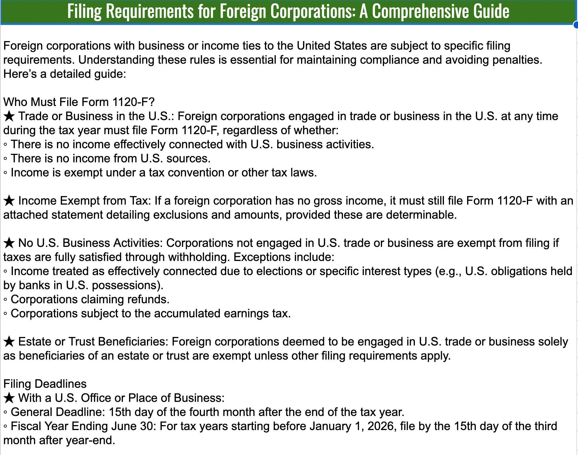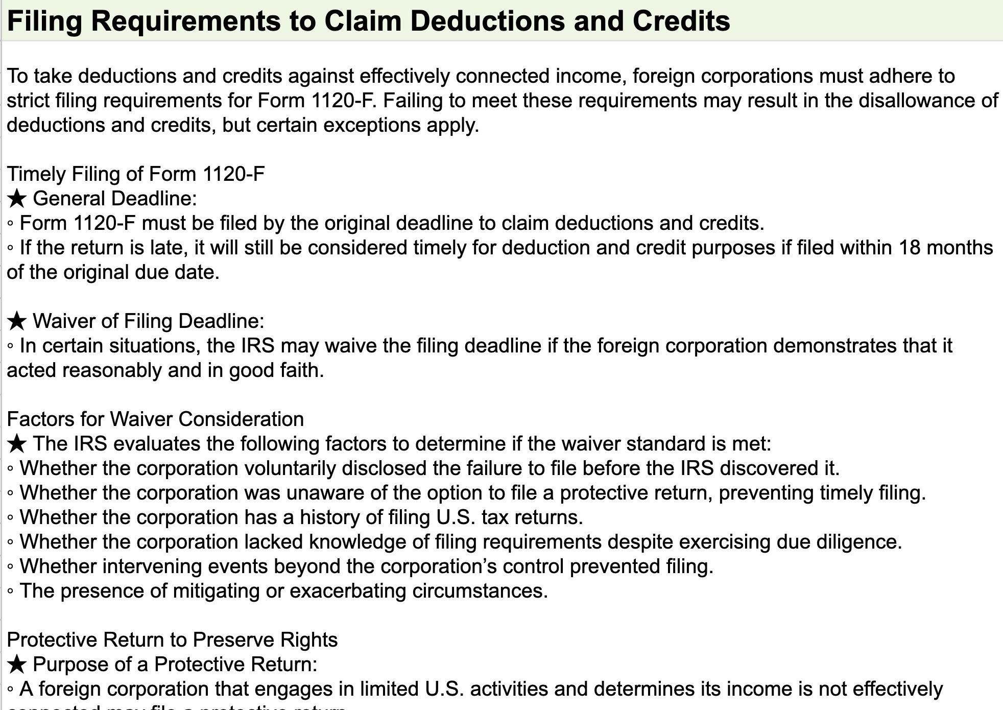 Comprehensive Form 1120-F Checklist: Breaks down filing requirements into easy-to-follow steps, covering key topics like U.S. income tax treaties, deductions, and effectively connected income.