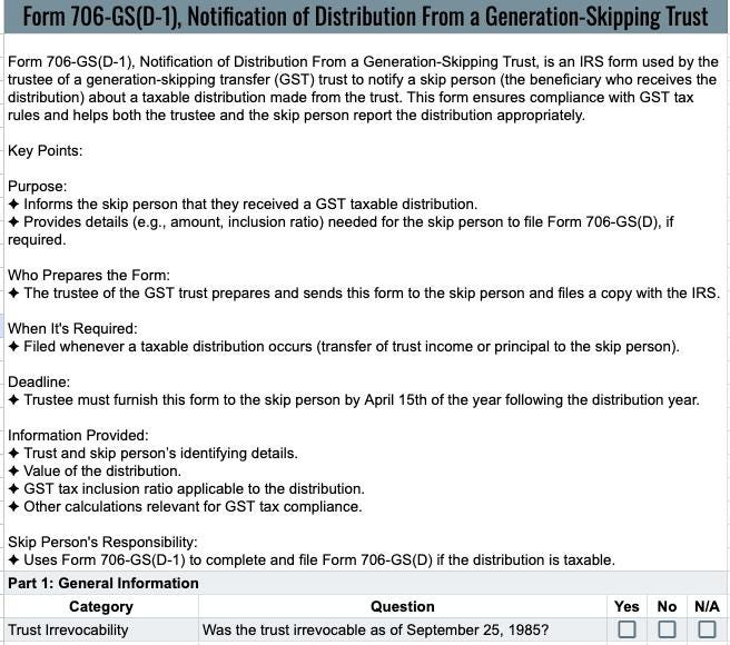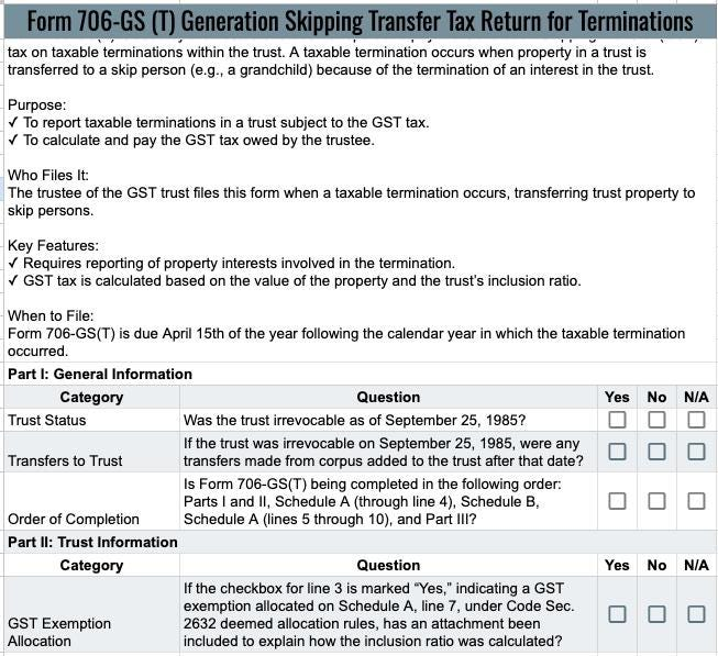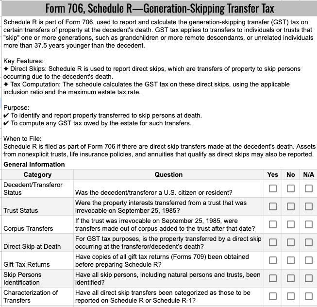 Streamline your estate and GST tax compliance process with our Form 706 Comprehensive Checklist Bundle. This all-in-one resource includes detailed, easy-to-follow checklists for Form 706, Schedule R, Schedule R-1, Form 706-GS(D), Form 706-GS(T), and Form 706-GS(D-1). Perfect for executors, trustees, and tax professionals, this bundle simplifies filing with step-by-step guidance tailored to IRS requirements. Whether you’re reporting taxable distributions, calculating GST exemptions, or preparing direct skip filings, our checklists ensure accuracy and save you time. Crafted by tax experts, this bundle is ideal for both personal and professional use.