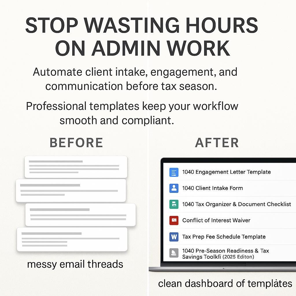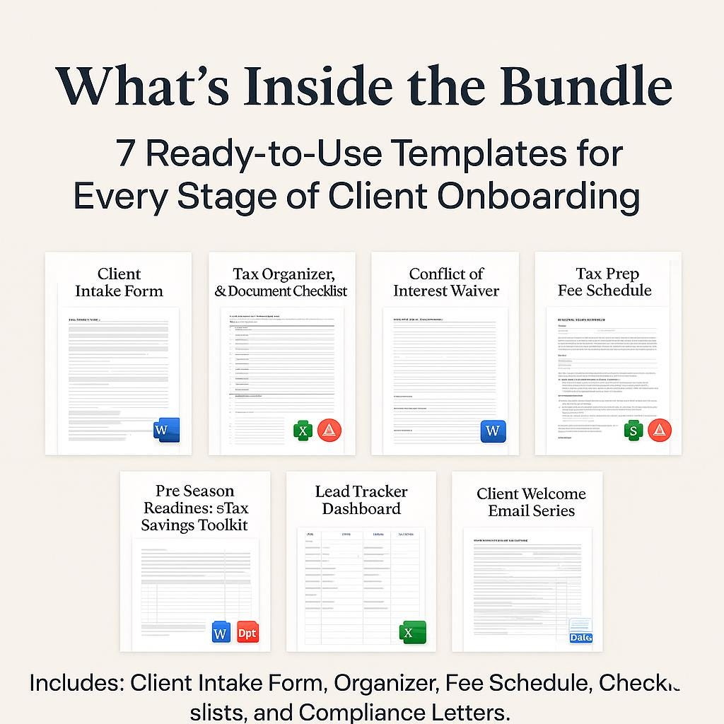 • This bundle includes every form and document you need before tax season — from your new client intake form and client onboarding template to tax preparer checklists, accounting templates, and a conflict of interest waiver.