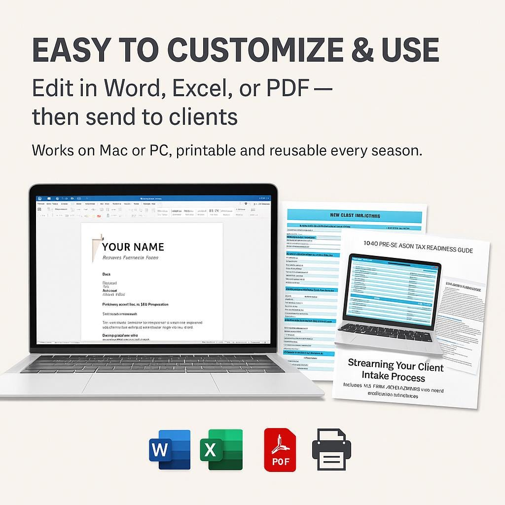 • Great for firms using Excel, Word, and PDF-based systems who want a polished, repeatable workflow for each new client.