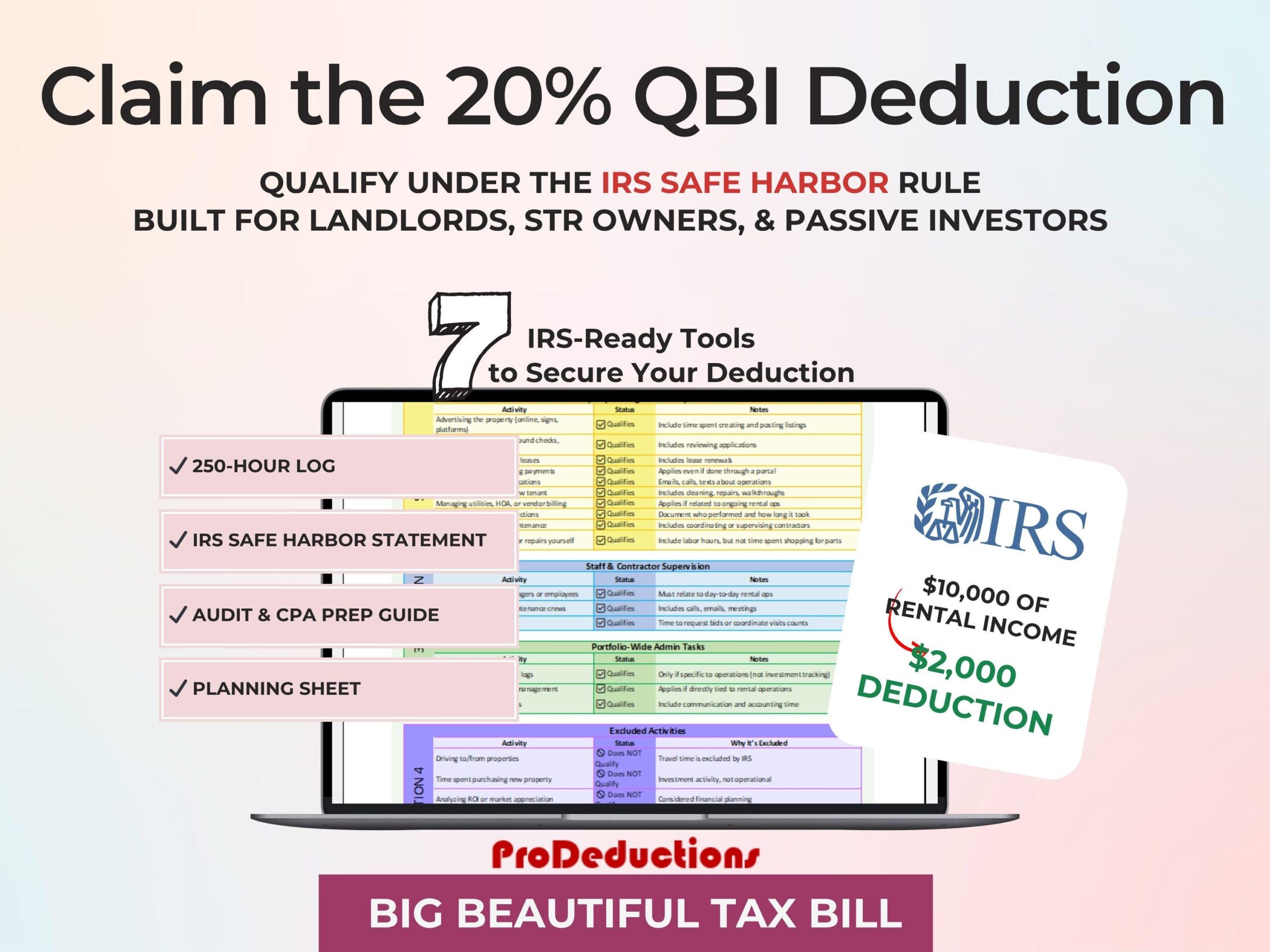 A complete, IRS-aligned QBI Safe Harbor tracking system for landlords claiming the Qualified Business Income (QBI) deduction under the Big Beautiful Tax Bill — formally known as §199A. This tool proves your rental qualifies as a business under Revenue Procedure 2019-38 using a 250-hour tracker, IRS statement templates, and built-in planning tools.