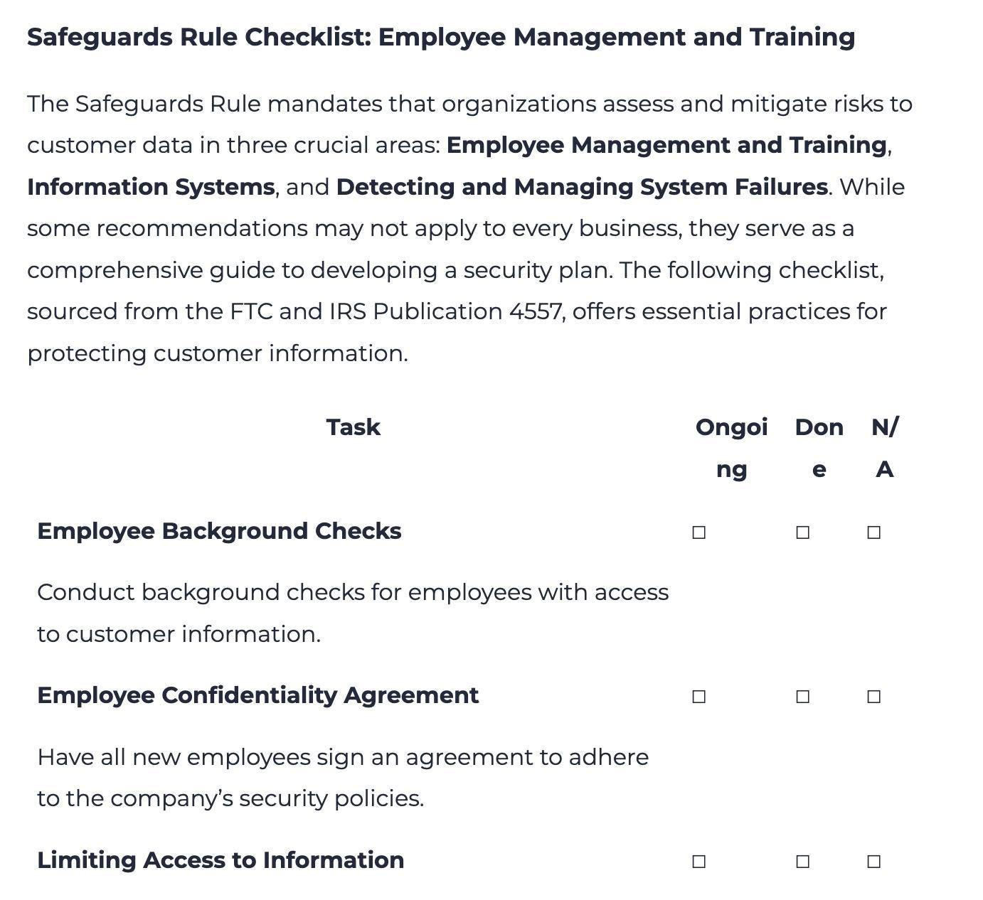 üîê Comprehensive Security: Covers critical areas like data storage, encryption, employee access control, and incident response.
