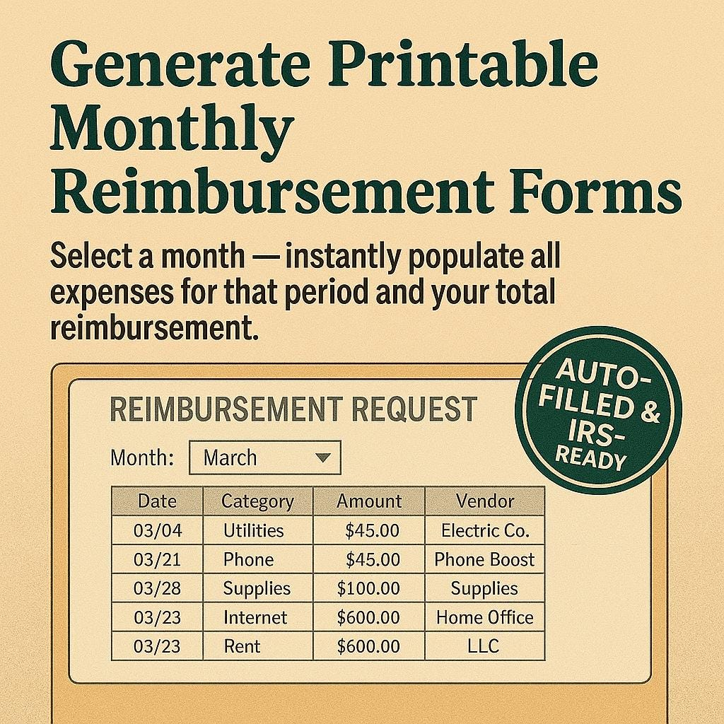 Use it to determine your business-use percentage, track monthly expenses, and generate printable reimbursement forms that keep your S-Corp audit-ready.