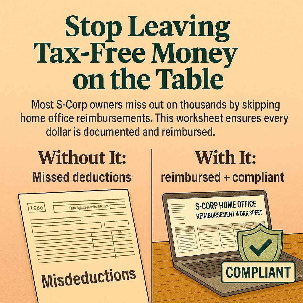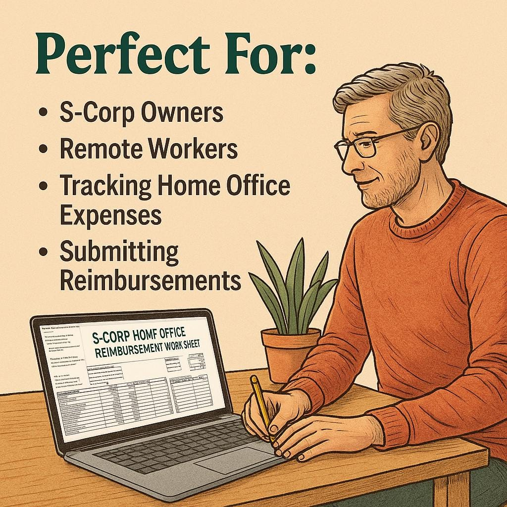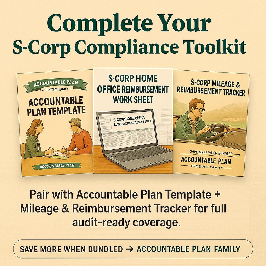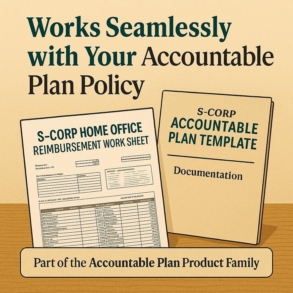 A professional Excel worksheet designed specifically for S-Corporation owners to calculate and document home-office reimbursements under an IRS-compliant Accountable Plan. It‚Äôs not the written plan itself ‚Äî it‚Äôs the tool that performs the math. Use it to determine your business-use percentage, track monthly expenses, and generate printable reimbursement forms that keep your S-Corp audit-ready. FOR […]
