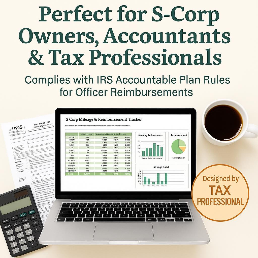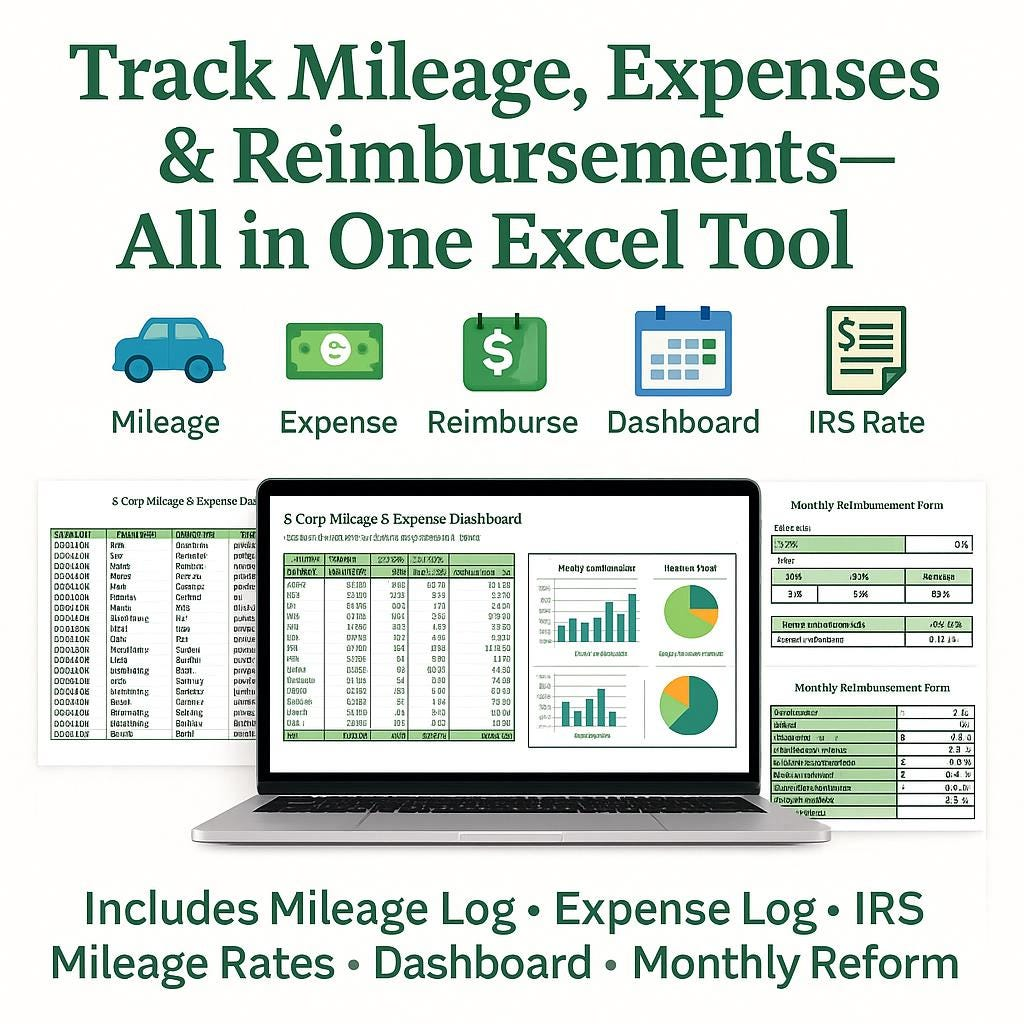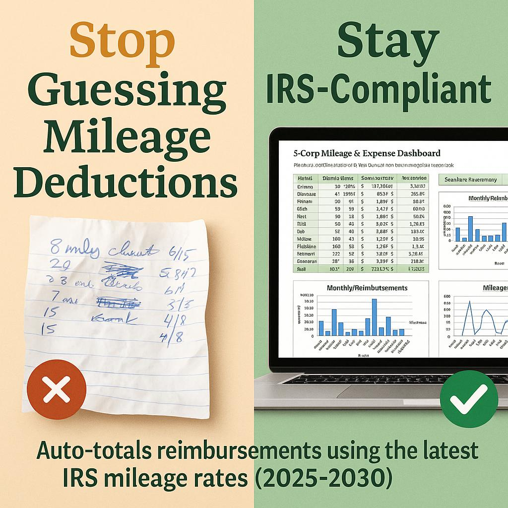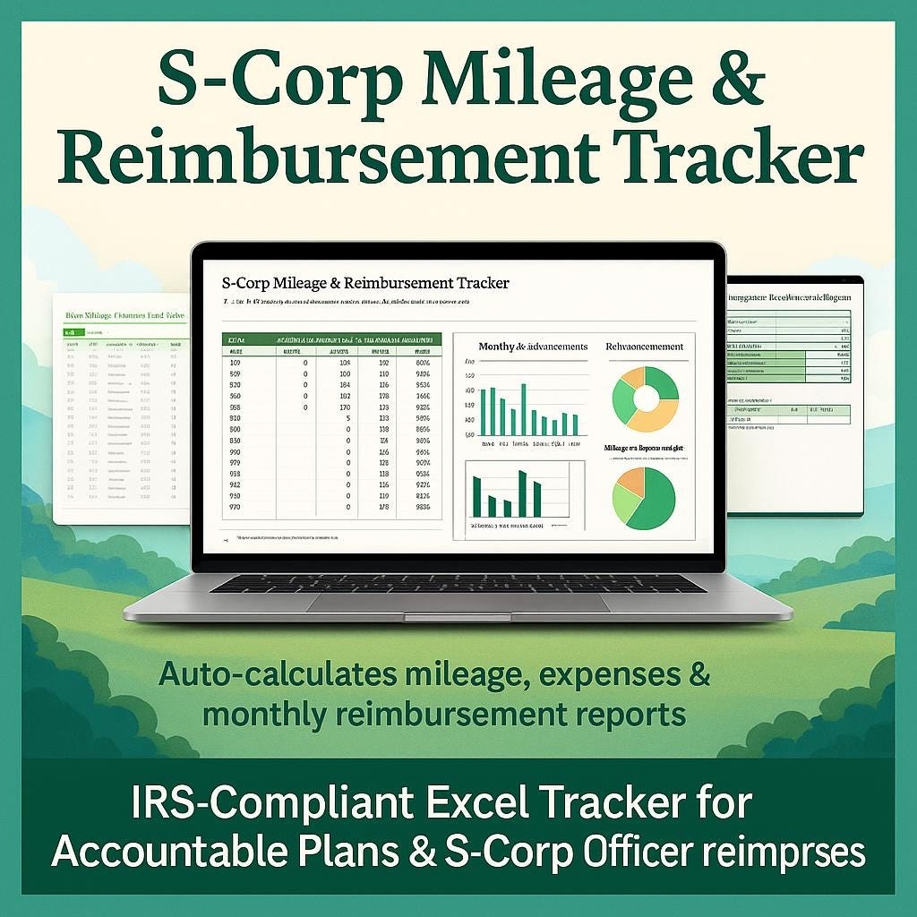 • A professional Excel mileage reimbursement tracker built for S-Corporations and Accountable Plans.
