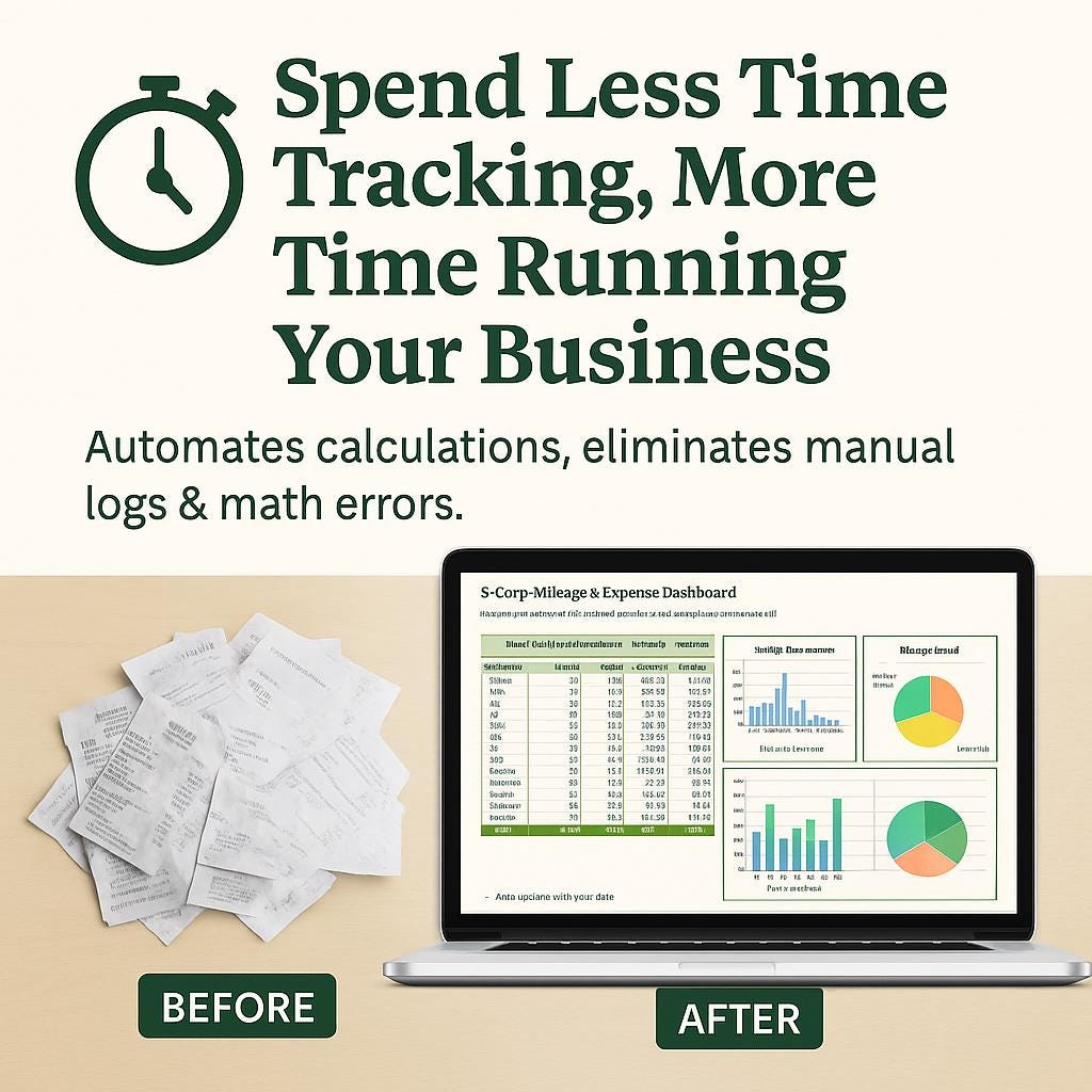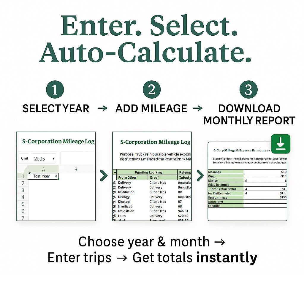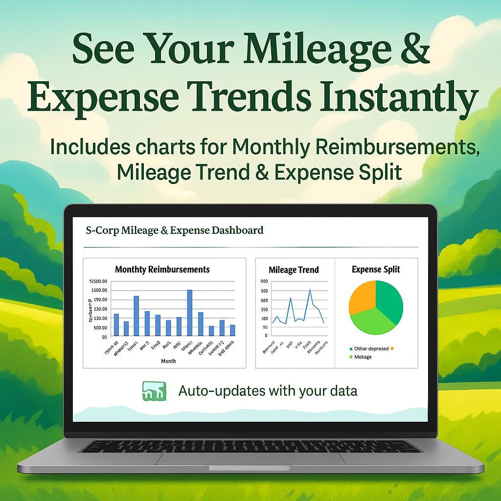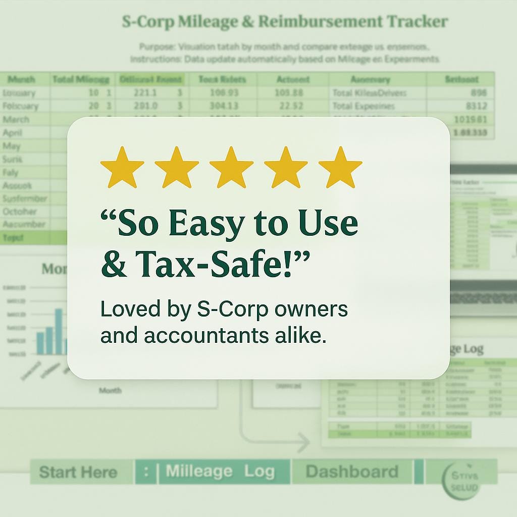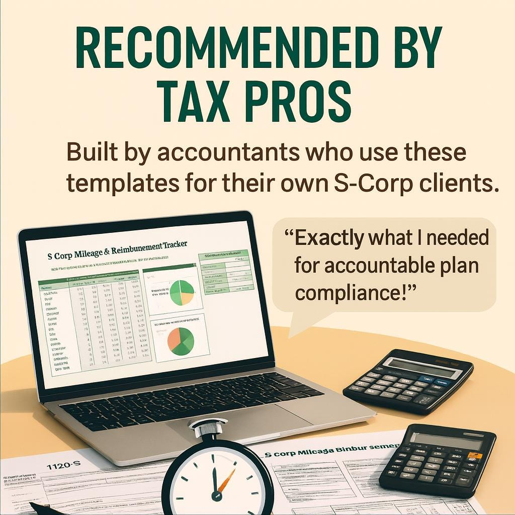• A professional Excel mileage reimbursement tracker built for S-Corporations and Accountable Plans.