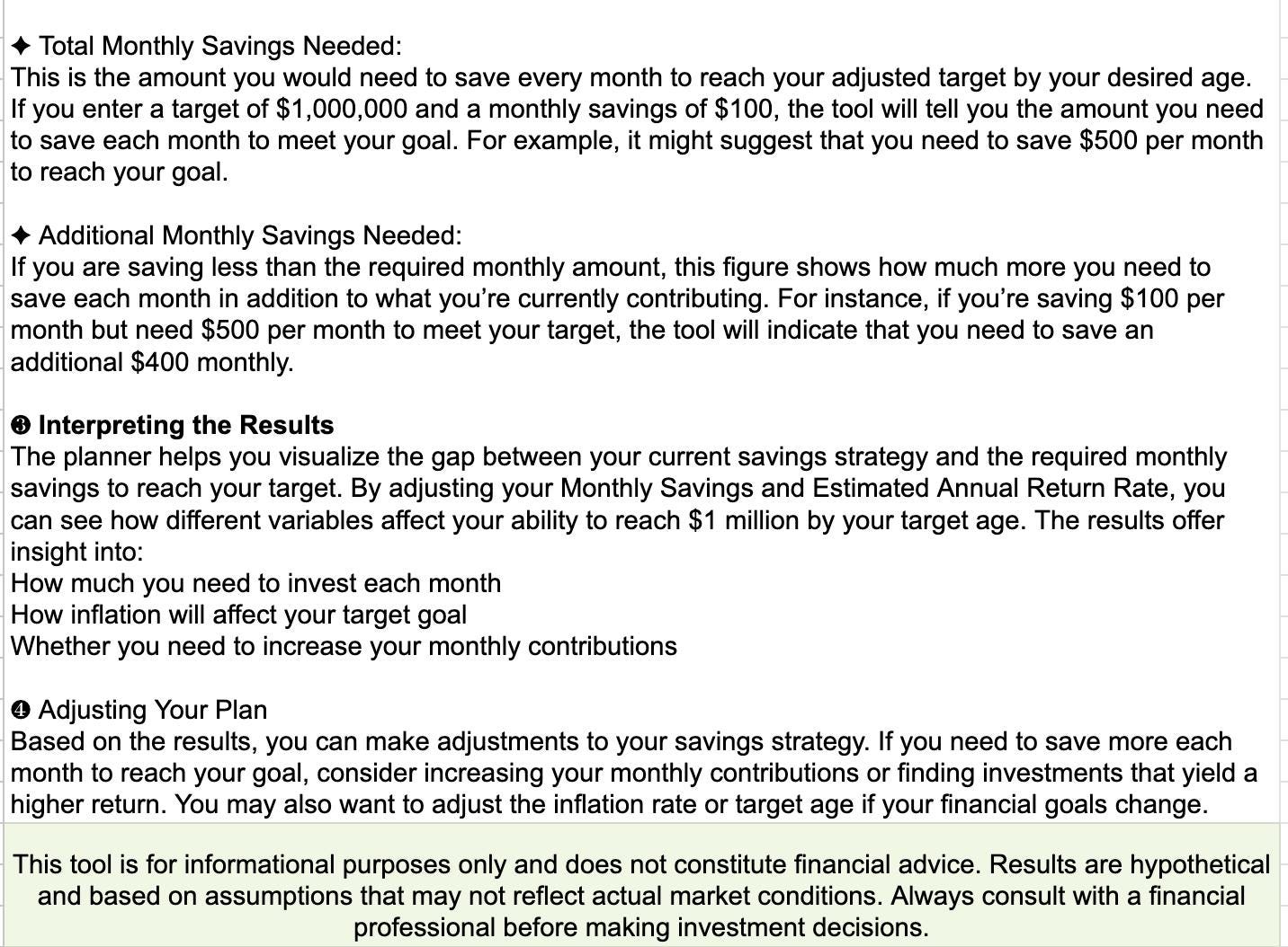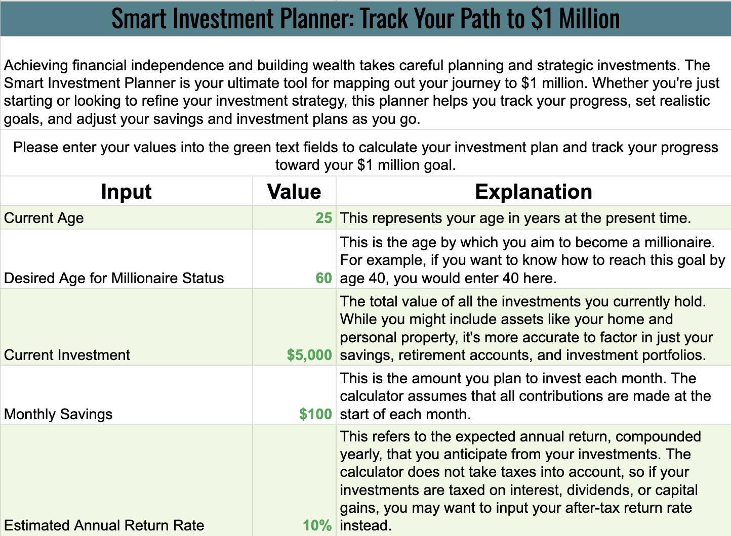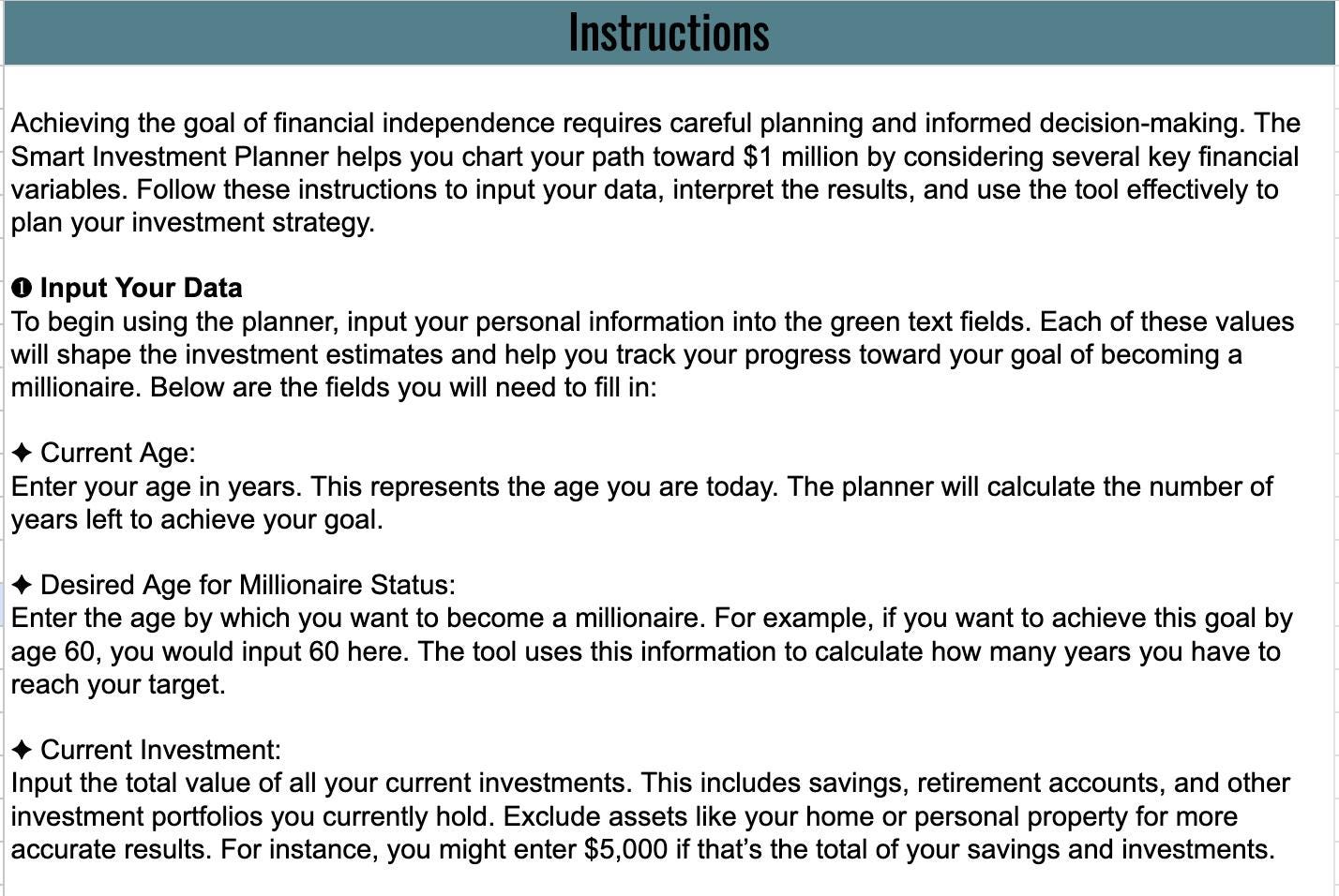 Perfect for aspiring investors, retirees, or anyone who wants to plan for a secure financial future, the Smart Investment Planner ensures that you can confidently work toward your million-dollar milestone.