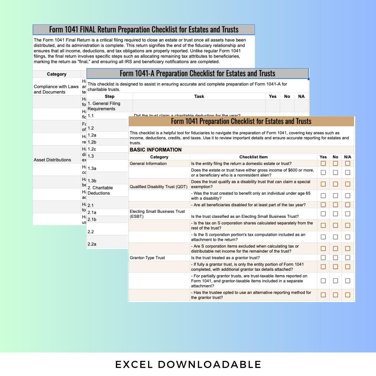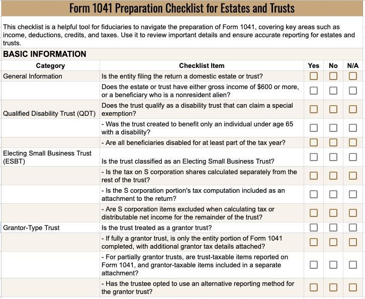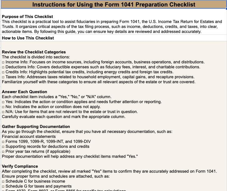 ‚û§ Form 1041 Checklist: Ensure accurate reporting of income, deductions, and credits for trust and estate income tax returns.