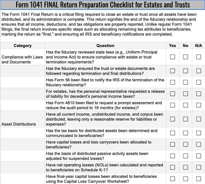‚û§ Final 1041 Checklist: Specialized guidance for the final tax return of a trust or estate, ensuring no detail is overlooked.