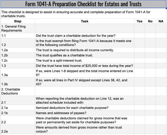 ‚û§ 1041-A Checklist: Simplify reporting for charitable distributions with this thorough checklist.