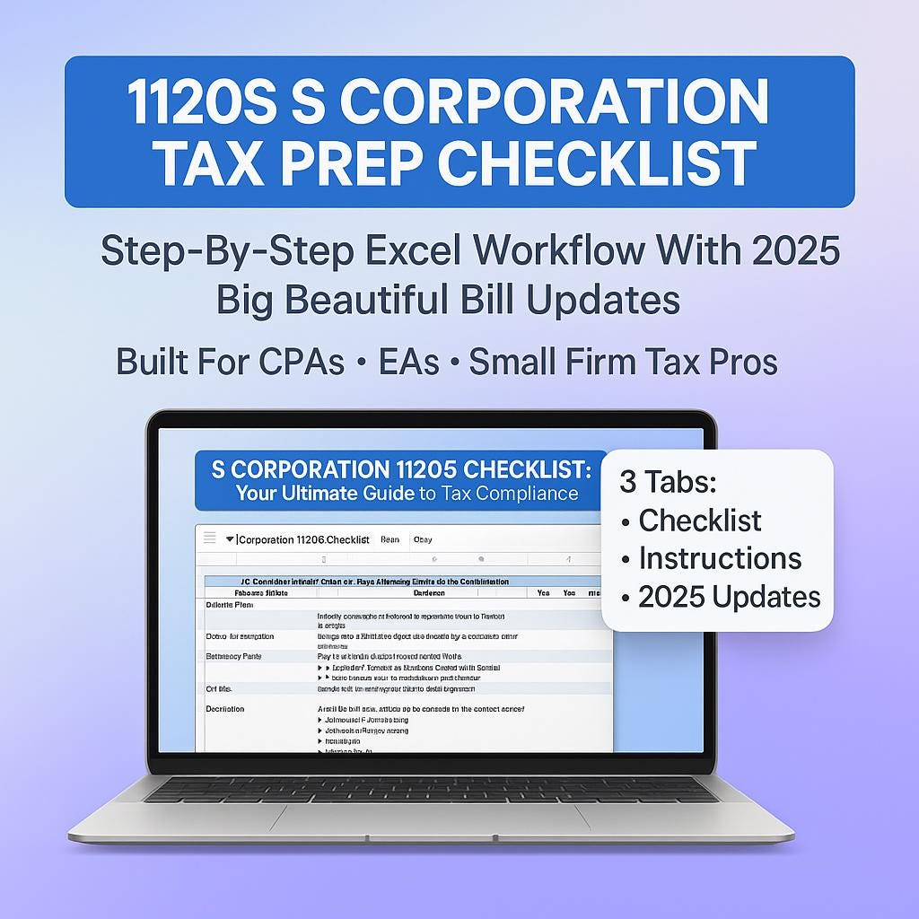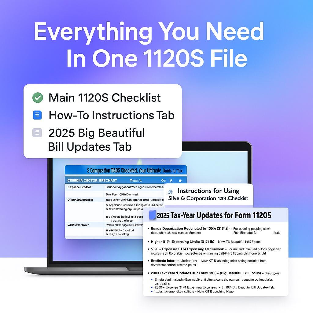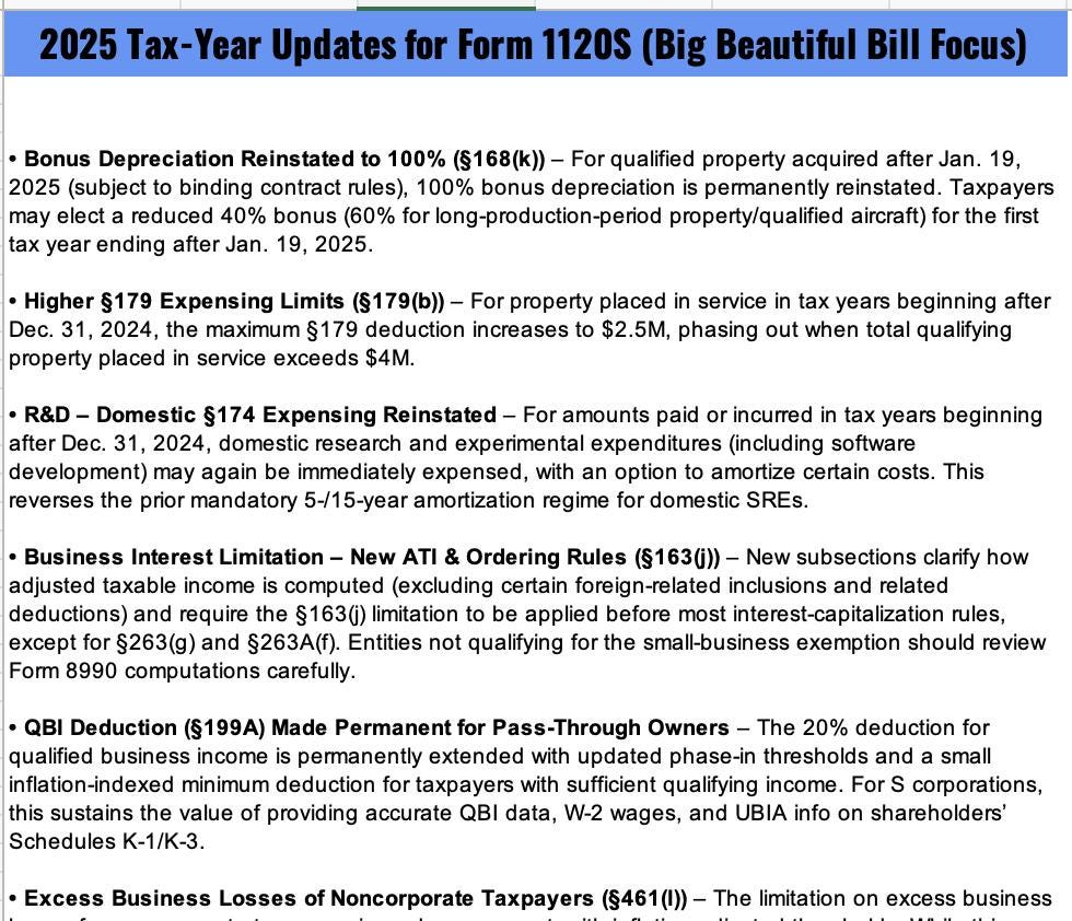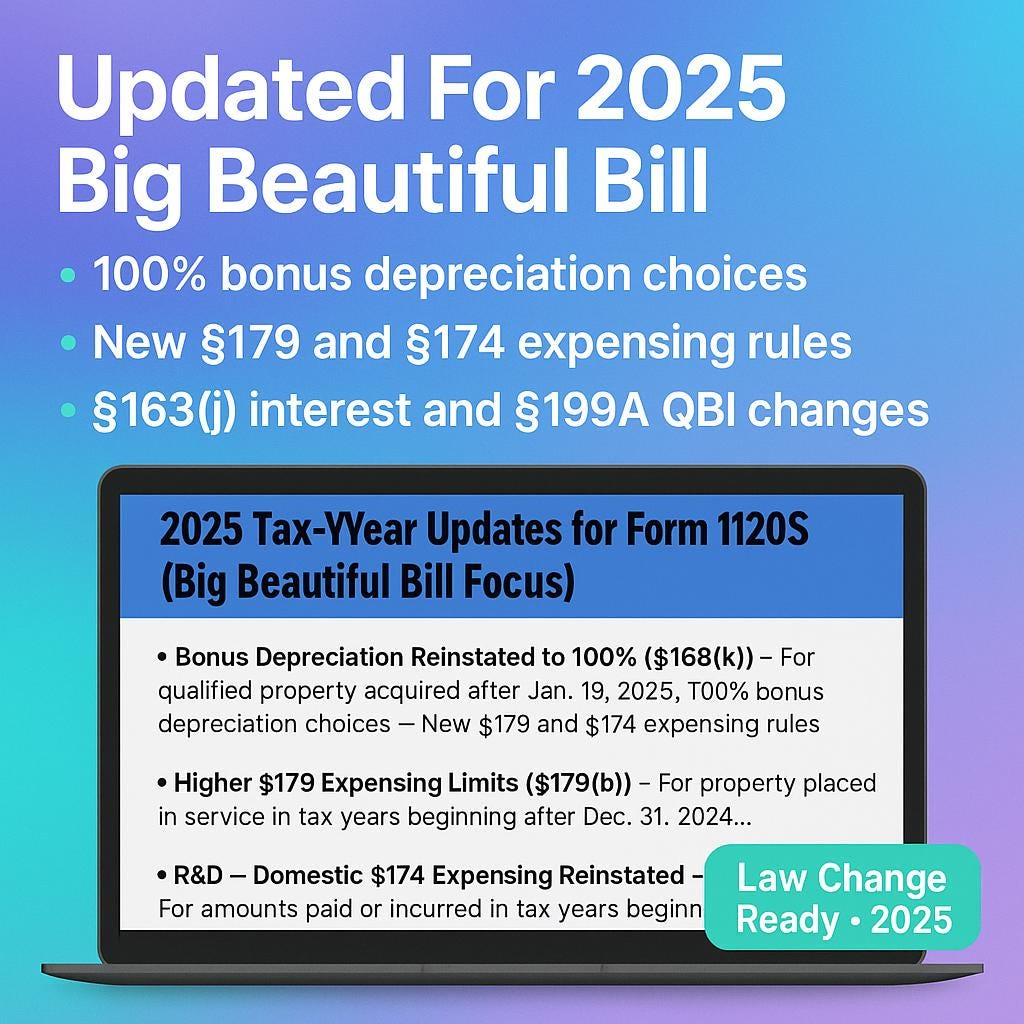 • Includes a dedicated 2025 Tax-Year Updates for Form 1120S – Big Beautiful Bill Focus tab so you do not miss new depreciation, QBI, interest and loss rules
