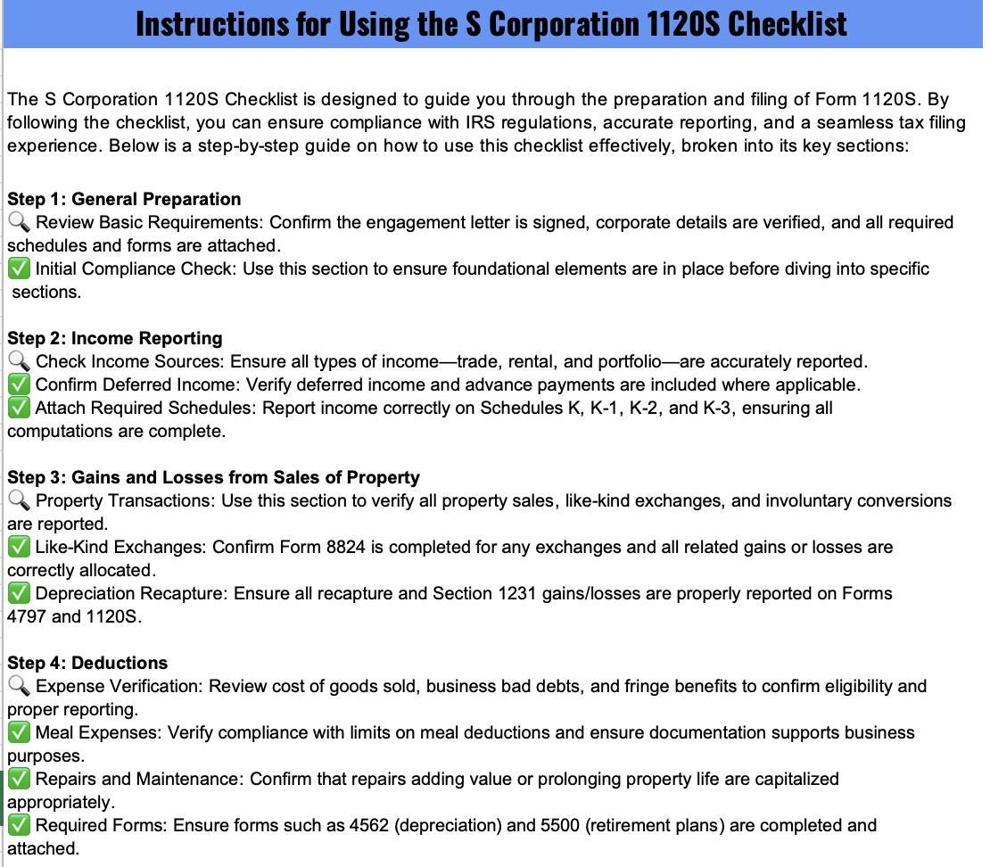 • Instructions tab – “Instructions for Using the S Corporation 1120S Checklist” explaining Step 1 General Preparation through Step 4 Deductions and beyond so the team knows exactly how to use the tool