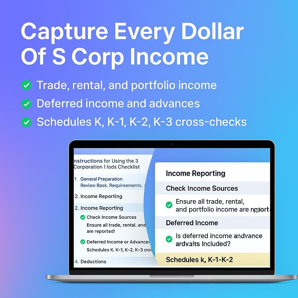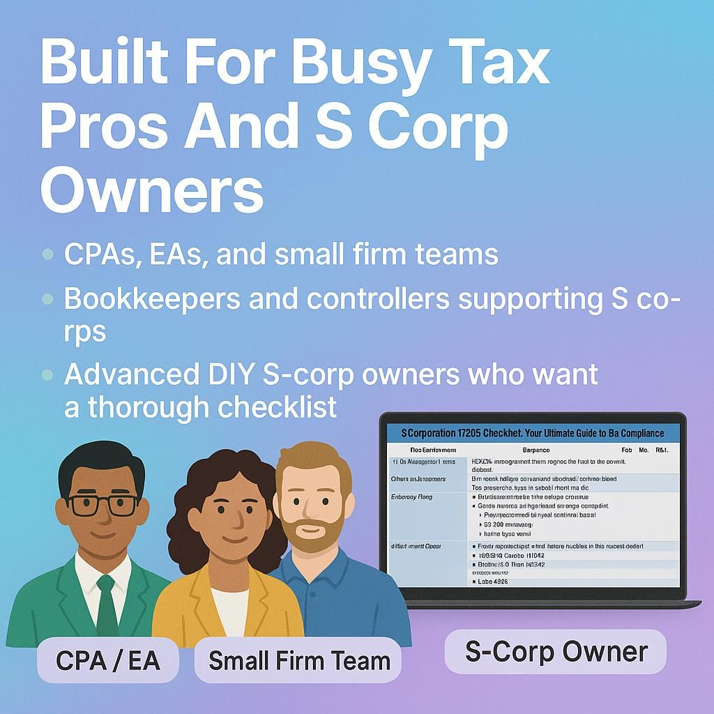 • Bookkeepers and CFOs supporting S corp clients and wanting a clear checklist for tax preparation before sending files to the tax pro