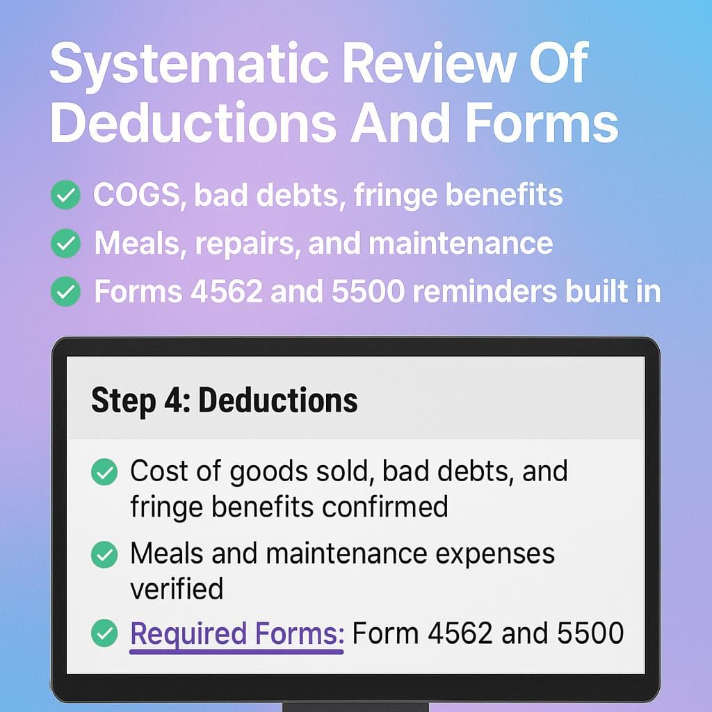 • Work through the Deductions section to verify cost of goods sold salaries benefits meals repairs depreciation and other deductions with documentation before you finalize the return