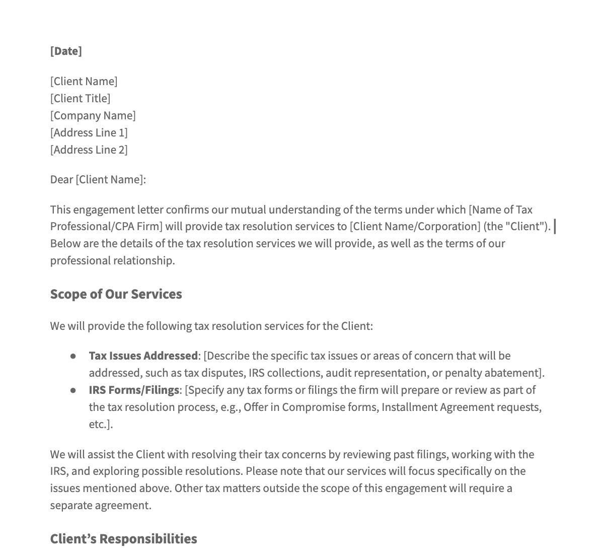 Whether you’re handling back taxes, IRS audits, wage garnishments, or negotiating settlements, this Tax Resolution Engagement Letter Template ensures your clients are informed and your business is protected. Get started today and simplify your client onboarding process!