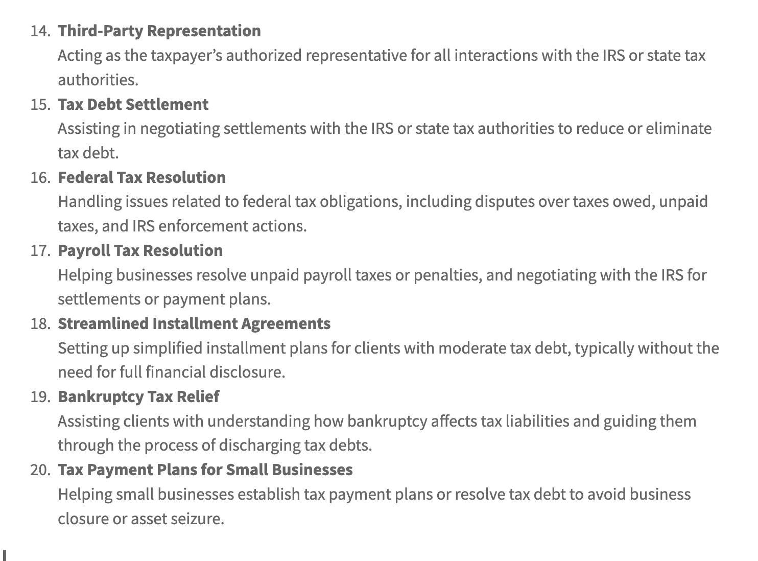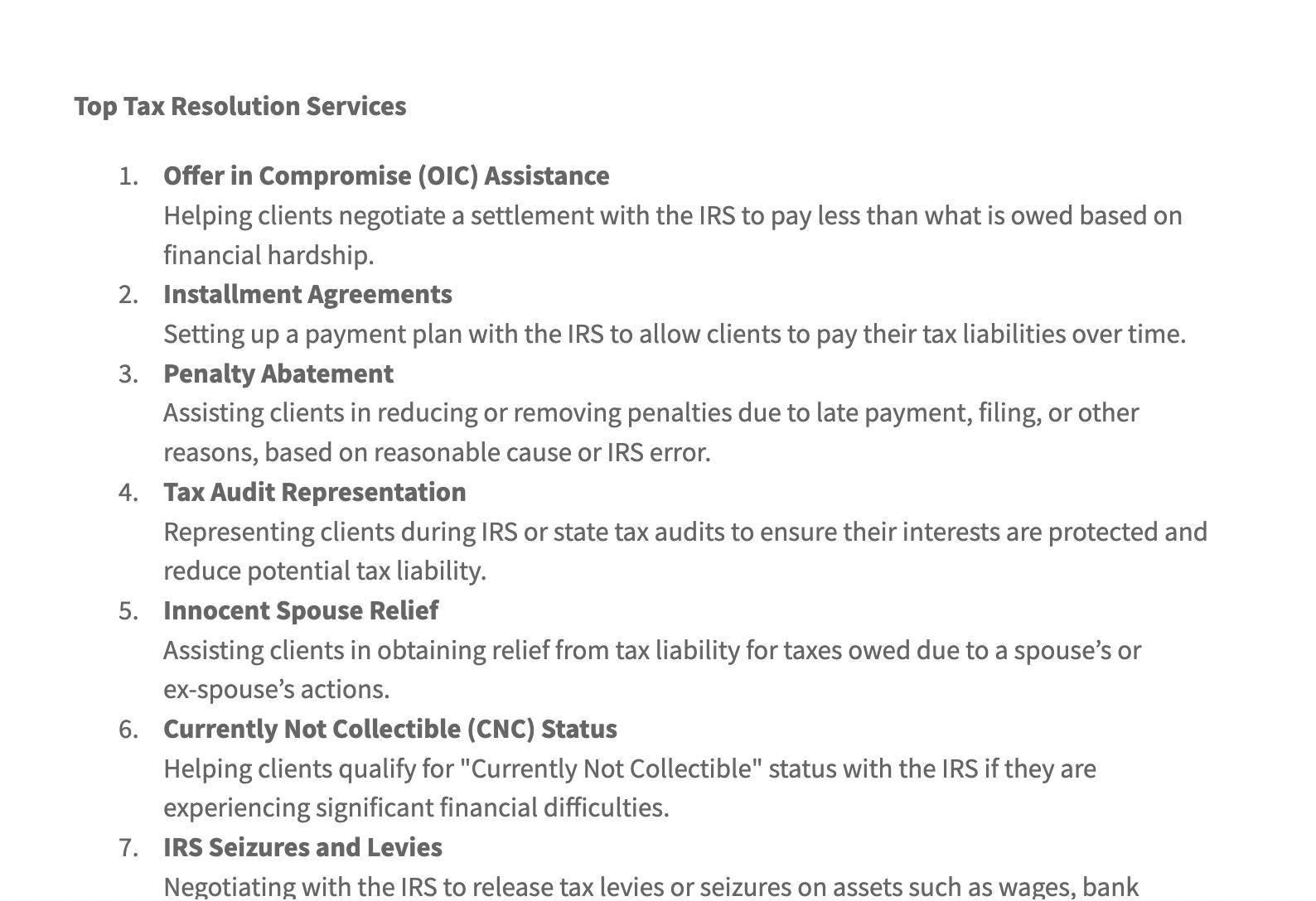 Comprehensive Scope: Covers a wide range of tax resolution services, including Offer in Compromise, Installment Agreements, Penalty Abatement, IRS Seizures and Levies, Tax Audit Representation, and more.
